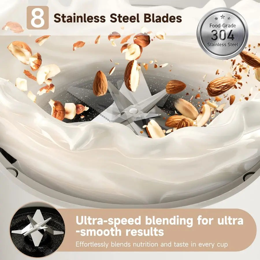 8Leaf Stainless Steel Blades Fine amp Consistent Grinding Equipped with 8leaf foodgrade 304 stainless steel blades, this nut milk maker delivers powerful crushing and thorough grinding. Achieve a smooth, creamy texture thats perfect for soy milk, nut milk, soups, juices, and baby food. The durable stainless steel design resists rust and wear, ensuring longlasting performance and safe daily use.
